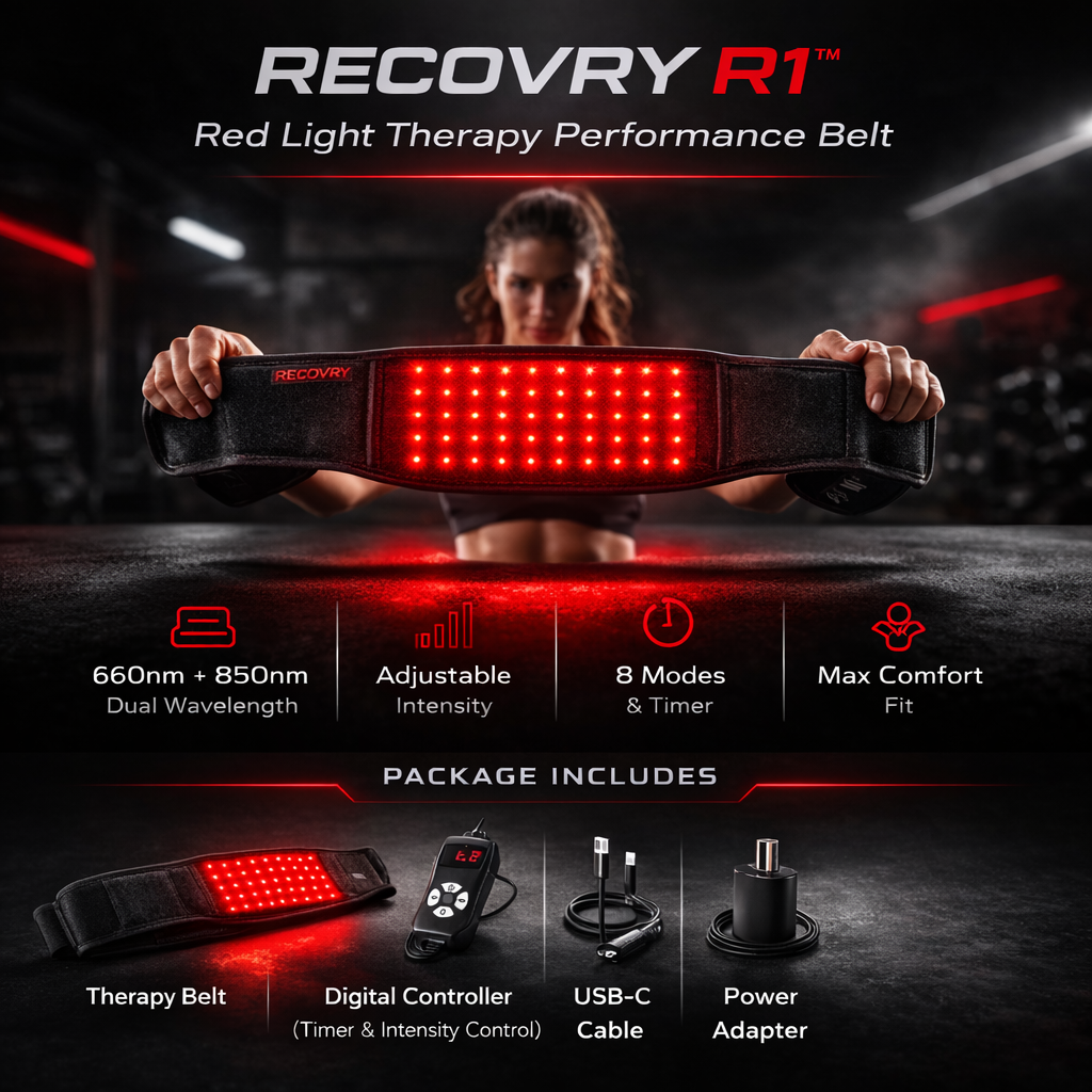 RECOVRY performance recovery technology uses targeted red and near-infrared light therapy to support muscle recovery, reduce inflammation, and help your body bounce back faster after intense training.